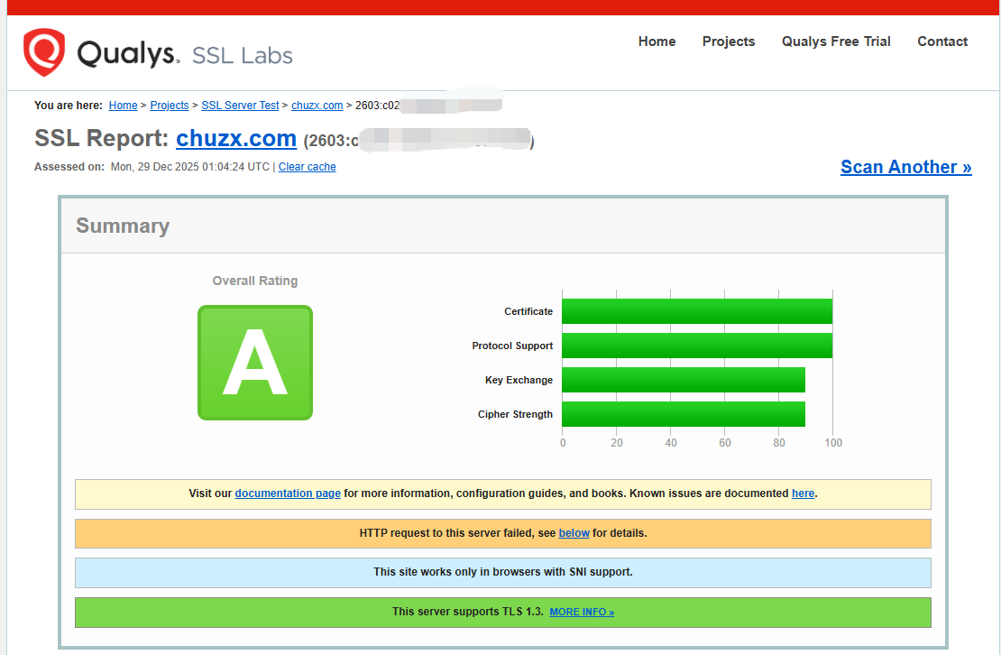 HSTS HSTS是国际互联网工程组织 IETF 正在推行一种新的 Web 安全协议,网站采用 HSTS 后,用户访问时无需手动在地址栏中输入 HTTPS,浏览器会自动采用 HTTPS 访问网站地址,从而保证用户始终访问到网站的加密链接,保护数据传输安全。 HSTS 原理 HSTS 主要是通过服务器发送响应头的方式来控制浏览器操作: 1、首先在服务器响应头中添加 HSTS 响应头:Strict-Transport-Security: max-age=expireTime [; includeSubDomains] [; preload] 此响应头只有在 https 访问返回时才生效,其中[ ]中的参数表示可选; 2、设置 max-age 参数,时间设置不宜过长,建议设置时间为 6 个月; 3、当用户下次使用 HTTP 访问,客户端就会进行内部跳转,并且能够看到 307 Redirect Internel 的响应码; 4、网站服务器变成了 HTTPS 访问源服务器。 开启 HSTS 后网站可以有效防范中间人的攻击,同时也会省去网站 301/302 跳转花费的时间,大大提升安全系数和用户体验。 开启 HSTS 后网站安全系数检测测评 开启 HSTS 以后,可以到 ssllabs 进行测试,网站的安全等级会进一步提升。 开启前等级为:A